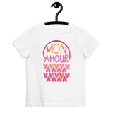 Mon Amour is painted in gouache. The lettering rests beneath an arch, and sits on a cluster of hearts in shades of shifting pink and orange. This design is not only a romantic print but also a sweet message on a kid's t-shirt.